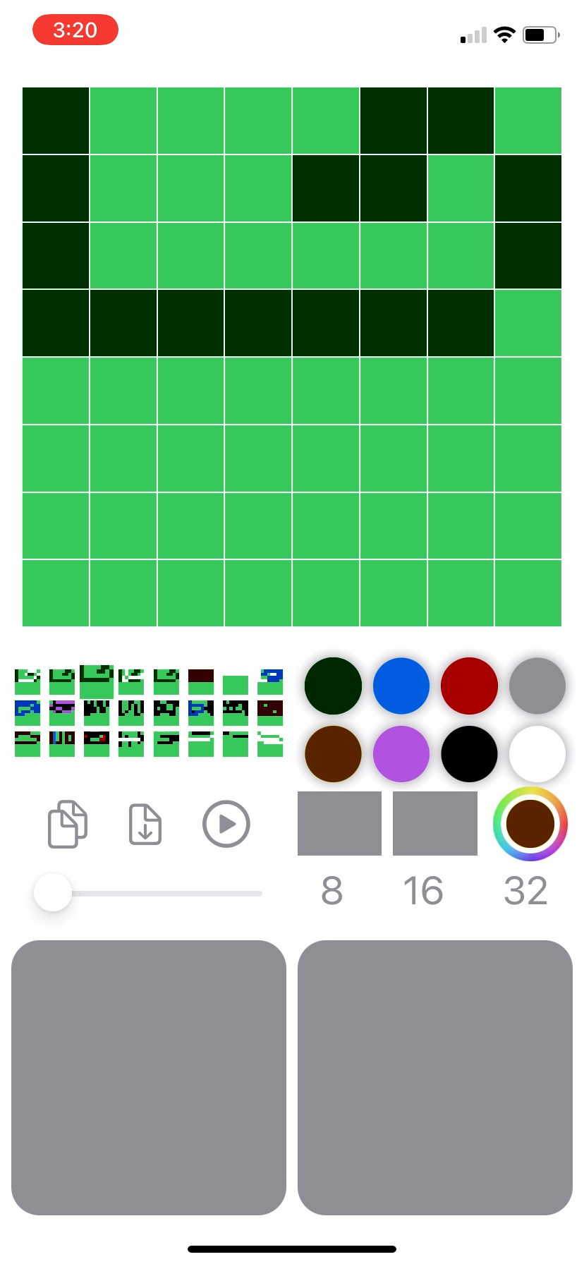 I made and learned so much in such a short amount of time that I never really thought about exactly what I was making… until I hit a major hurdle. The grid and most of the app worked well but when it was on the 32x32 option I had some major CPU spikes and performance issues. After a lot of troubleshooting I discovered that the entire UI was redrawing itself when anything updated on the app… which at that size is 1024 rectangles (plus all the other elements on the screen).