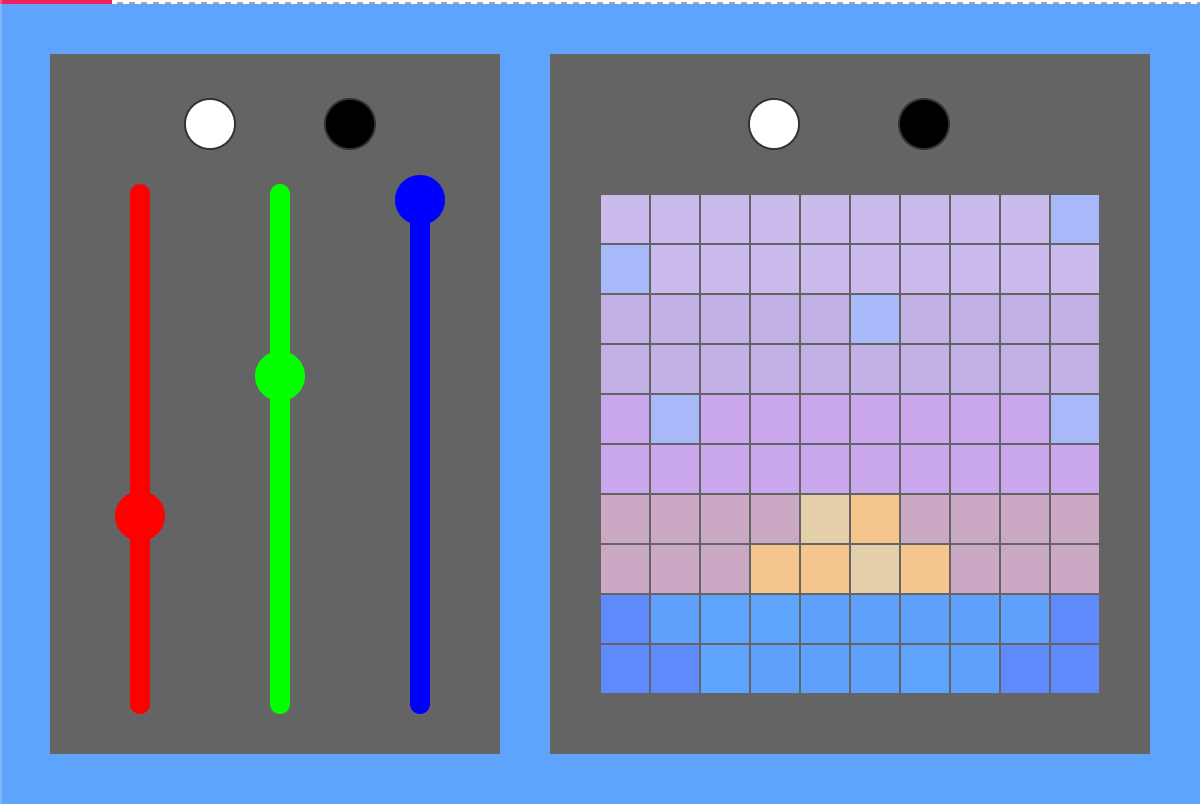 There might have been a way to fix the performance issue in the code but, as a beginner, I could not figure it out. After weeks of researching and racking my brain I ultimately decided to start from scratch on the grid. With the knowledge and practice of my first attempt making my second grid didn’t take too long and I had a better functioning art board. This new grid is limited to 24x24 in size but has some built in animation, is variable in size (1x1, 2x2, 3x3, etc.), and has made me re-think some of the other UX/UI (user experience/user interface).